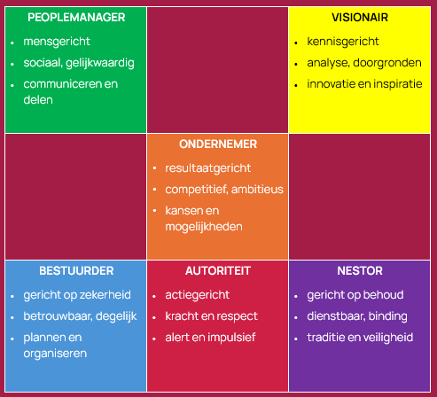 Iedere kleur binnen Management Drives staat voor een unieke drijfveer. Samen geven ze inzicht in hoe mensen denken, communiceren en samenwerken. Hieronder zie je de zes kleuren.