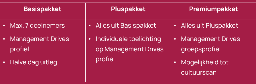 - We kijken verder dan het profiel. Een Management Drives profiel is een startpunt. We vertalen de inzichten naar gedrag, samenwerking en communicatie, zodat je weet wat je morgen anders kunt doen.